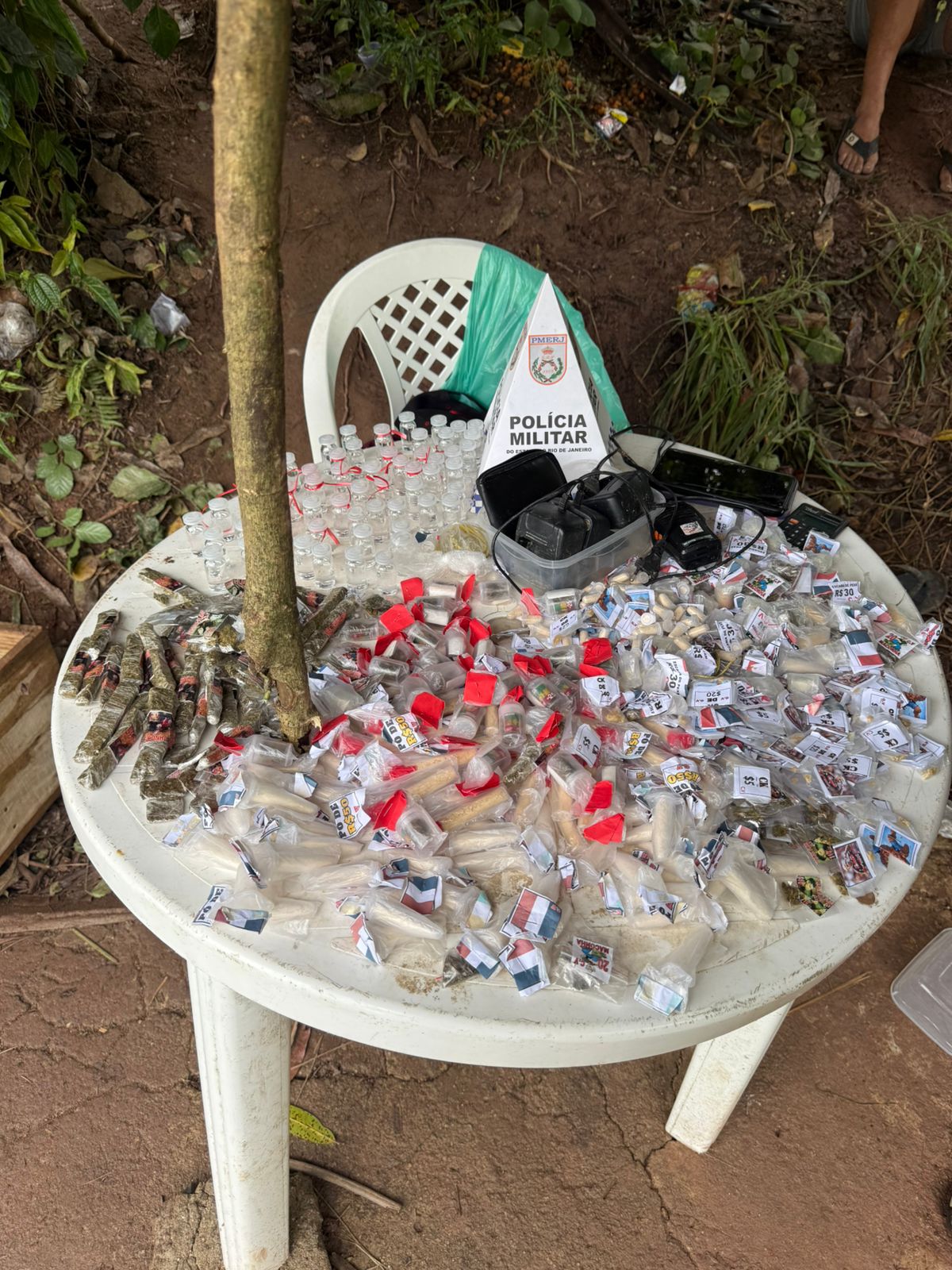 No local, os policiais apreenderam 210 pinos de cocaína, 180 pedras de crack, 87 tiras de maconha, 65 porções de skank, 61 frascos de loló, três bases de carregadores de rádio transmissor, dois aparelhos celulares, um rádio transmissor e R$ 41 em dinheiro. Todo o material foi recolhido.