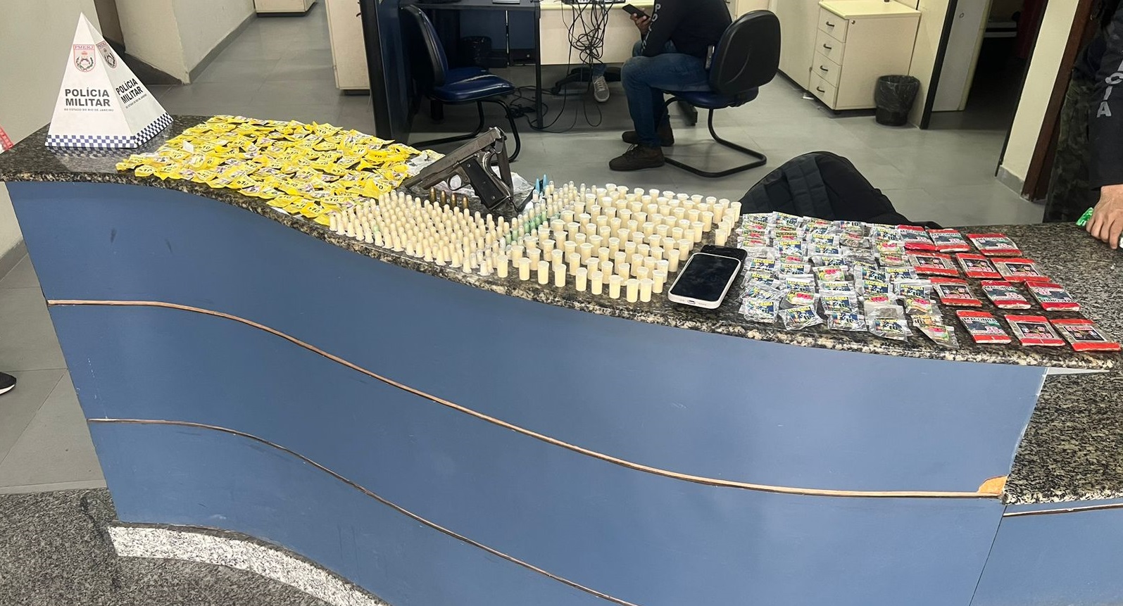 Diante da informação, que foi encaminhada ao 33º Batalhão (BPM), agentes do serviço reservado realizaram uma grande operação na tarde do sábado, 17, e apreenderam 280 pinos de cocaína, 130 pedras de crack, 57 tabletes de maconha, cinco black lança, uma pistola calibre 45, um carregador de pistola, quatro munições e dois telefones celulares.