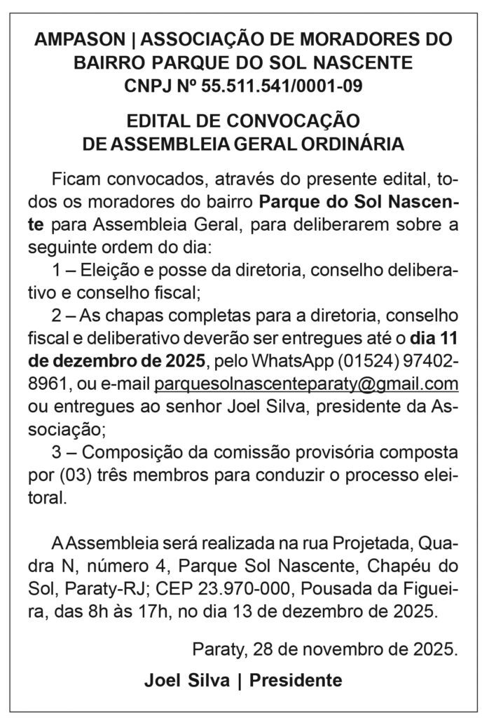 A Associação de Moradores do Bairro Parque Sol Nascente convoca todos os moradores do bairro para Assembleia Geral Ordinária, para deliberarem sobre a ordem do dia abaixo, como detalhado no ‘edital’ seguinte: