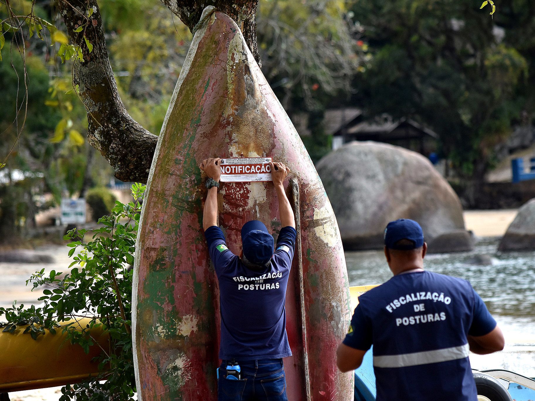 Durante a fiscalização, a Secretaria de Comércio e Postura notificou 19 embarcações de pequeno porte que ocupavam irregularmente a faixa de areia da praia, além de um carrinho de ambulante fora das normas.