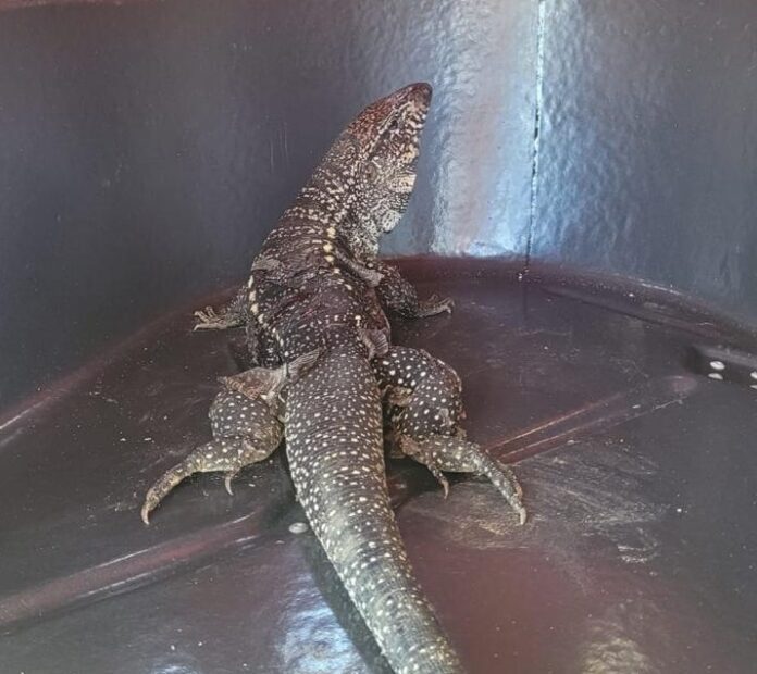 Um lagarto espécie teiú foi resgatado na última segunda-feira, 12, no quintal de uma residência na Reserva Ecológica da Juatinga (REEJ), em Paraty. A equipe de guarda-parques do Instituto Estadual do Ambiente (Inea/RJ) foi acionada pelo morador após avistar o animal no terreno da casa.