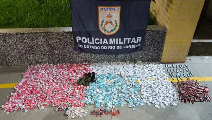 Foram recolhidos 7,2 quilos de cocaína, distribuídos em mais de 2 mil invólucros plásticos (eppendorfs) e centenas de sacolés, além de 700 gramas de maconha, 250 gramas de haxixe e 90 pedras de crack. Também foram apreendidos três rádios transmissores e um cinto náutico, utilizados, segundo a PM, na logística da atividade criminosa.